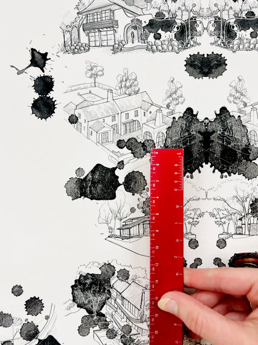 An original, avant garde pattern emerged from selecting various sketches by: Eddie Maestri in conjunction with adding our own Ever ink blot marks on top of Maestri’s architectural line drawings. The idea behind this art is the basis of pure concept. Some of Maestri’s renderings were built into homes, and some have not been. The importance of adding our own ink marks blurs the idea between concept. Is this architecture or psychology?
